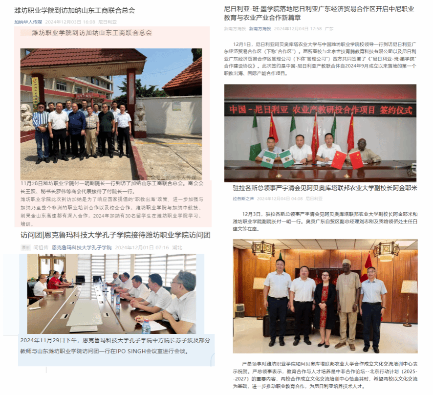 在加纳,访问团先后访问中国航空技术国际控股有限公司、加纳山东工商联合总会,并建立战略合作伙伴关系,调研了部分中资企业;访问加纳库马西技术大学,就“未来非洲”机电专业人才联合培养项目和“网络中文课堂”项目的运营和推进进行洽谈,并就下一步合作进行了深度探讨;访问恩克鲁玛科技大学孔子学院,双方交流了办学情况,洽谈了“中文+职业技能”人才培养等事宜;会见阿散蒂省省长西蒙·奥塞·门萨,座谈交流中他表示将全力支持库马西市与潍坊市两座友好城市继续深化教育、科技、经贸等方面合作,支持库马西技术大学与我院深度开展人才联合培养。